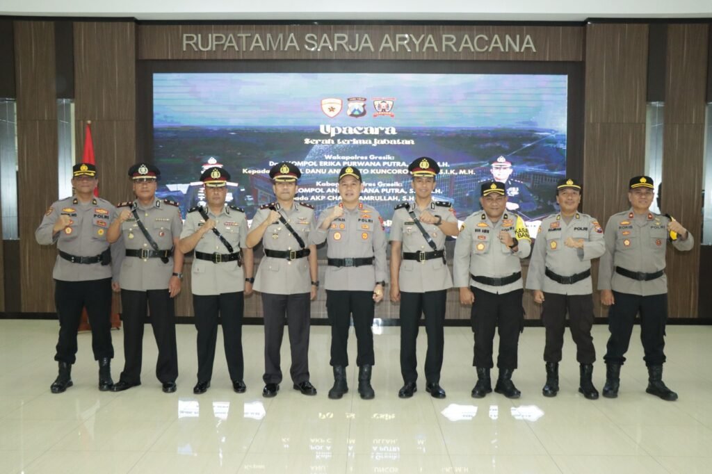 GRESIK – Kapolres Gresik AKBP Adhitya Panji Anom memimpin serah terima jabatan (sertijab) Wakapolres Gresik dan Kabag Ops Polres Gresik di Mapolres Gresik, Jumat (5/1/2024).