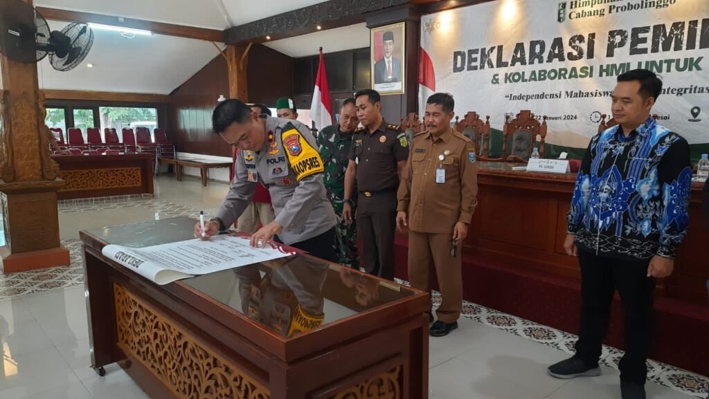Deklarasi pemilu damai ini juga dihadiri oleh Pj Sekda Bupati Probolinggo Heru Sulistyanto, Ketua KPU Kabupaten Probolinggo Lukman Hakim, Pabung Kodim 0820 Probolinggo, Kasat Intelkam Polres Probolinggo, Kasi Inter Kajari Kabupaten Probolinggo, Pengurus dan anggota HMI Kabupaten Proboliggo. (*)