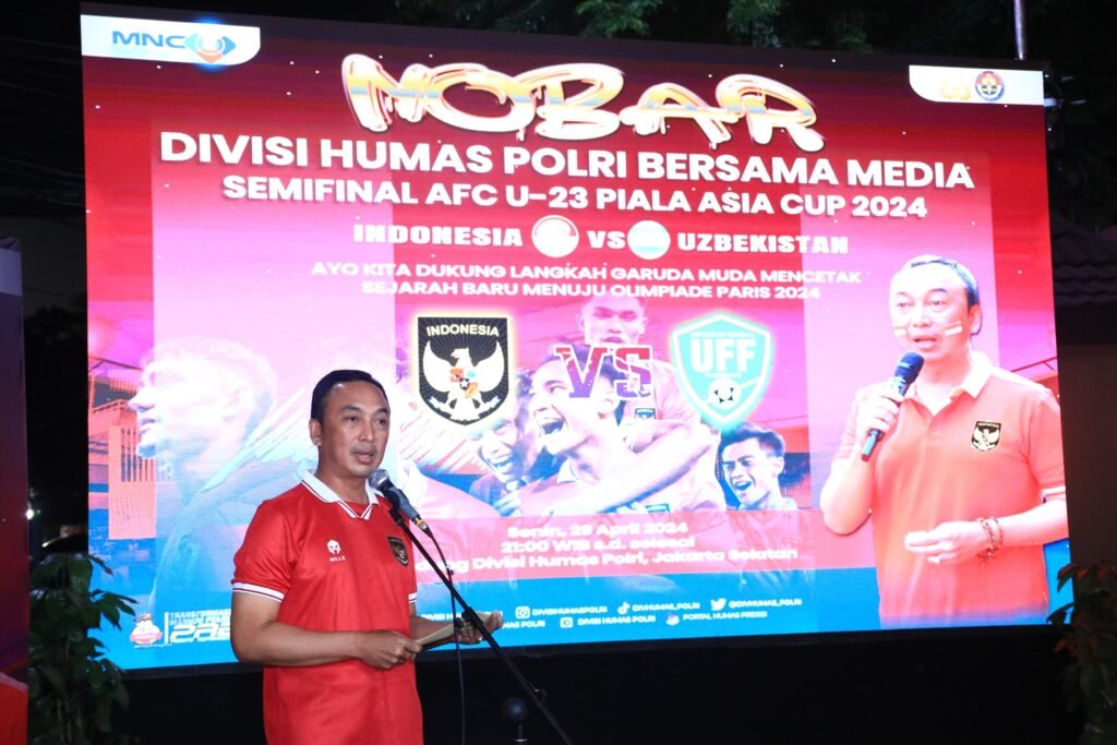 “Polri menggelar nobar di Mabes Polri, Mapolda dan Mapolres seluruh Indonesia. Hari ini Divisi Humas Polri menggelar nobar bareng wartawan. Di wilayah nobar lainnya juga melibatkan masyarakat yang ingin ikut mendukung Timnas Indonesia U-23 yang berlaga di semifinal Piala Asia U-23 melawan Timnas Uzbekistan U-23,” kata Sandi usai nobar bareng wartawan di kantor Divisi Humas Polri, Jakarta, Senin (29/4/2024).