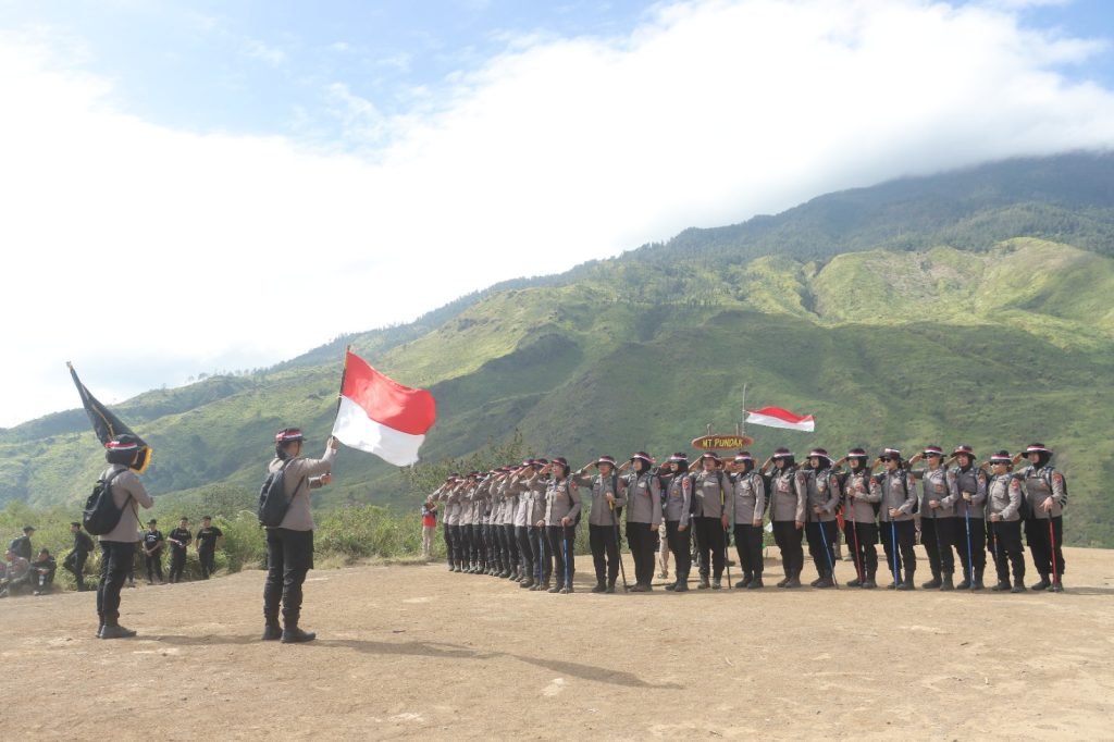 Diatas puncak, Polwan Polres Mojokerto melaksanakan pengibaran bendera Merah Putih.