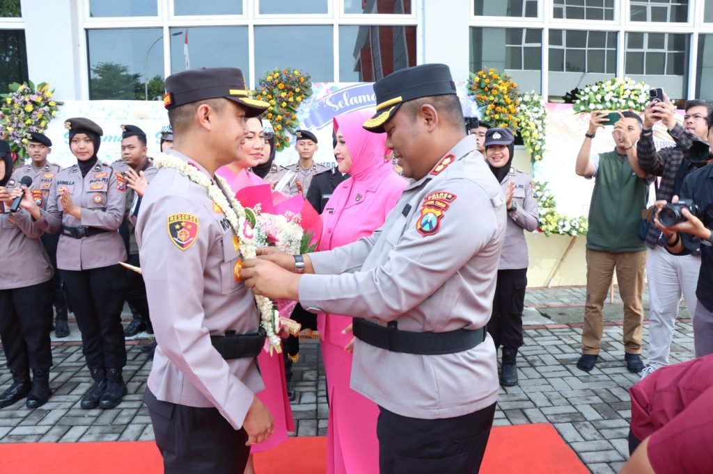 AKBP Rovan Richard Mahenu,S.I.K.,M.Si, didampingi Ketua cabang Bhayangkari Gresik Ny. Miranda Rovan diterima hangat oleh pejabat lama, AKBP Arief Kurniawan,S.I.K, bersama Ny. Chinthya Arief, melalui prosesi penyematan kalungan bunga. Alunan lagu “Selamat Datang Pahlawan Muda” yang dinyanyikan oleh seluruh personel Polres Gresik menambah semarak acara, menciptakan suasana yang penuh rasa kekeluargaan.