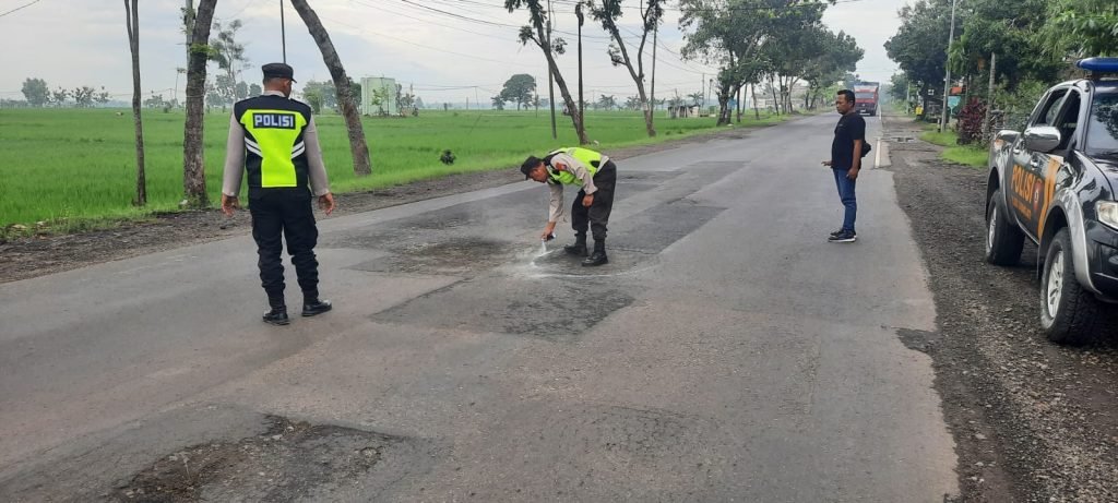 Seperti halnya yang dilakukan Polsek Karangjati Polres Ngawi kali ini dengan memberi tanda jalan menggunakan cat warna putih pada jalan yang berlubang.
