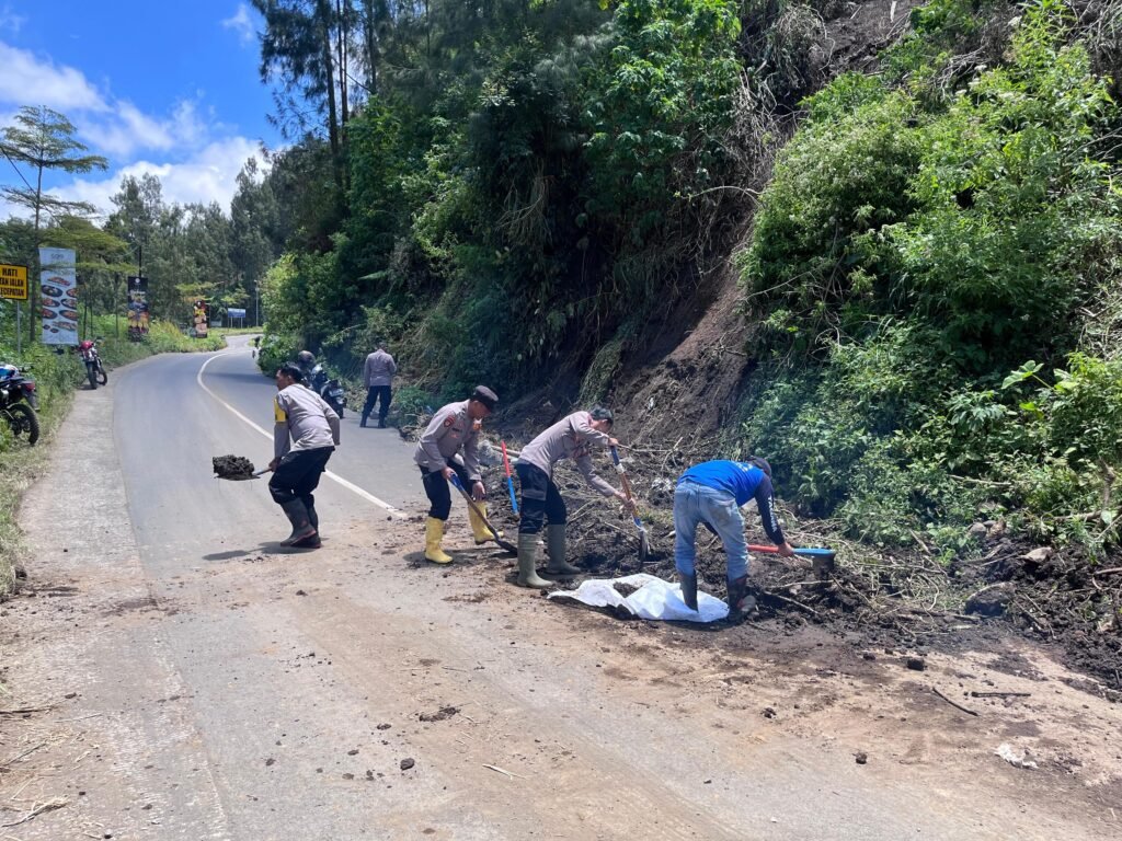 Anggota kepolisian bersama warga sekitar, bahu-membahu membersihkan material longsor agar kendaraan dapat melintas kembali di jalan tersebut.
