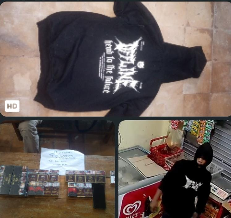 Korban kemudian memeriksa rekaman CCTV, dan terlihat seorang pria mengenakan hoodie hitam bertuliskan “OFFLINE” sedang beraksi di dalam toko.